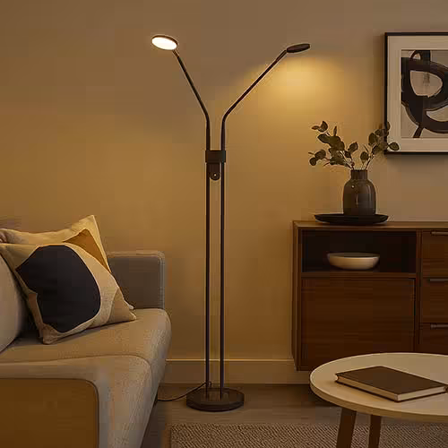Les lampadaires à deux sources lumineuses sont un modèle particulièrement pratique : Une lumière principale, également appelée plafonnier, qui éclaire la pièce, et une lampe de lecture flexible. Vous combinez ainsi un éclairage direct et indirect en un seul appareil - peu encombrant et extrêmement fonctionnel.