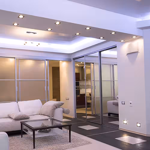 Dans le salon, nos spots LED encastrés à intensité variable créent des accents d'ambiance et des ambiances lumineuses individuelles. Utilisez-les par exemple dans des zones comme le canapé ou le coin lecture pour créer une atmosphère confortable. En même temps, ils soulignent le design moderne de la pièce grâce à leur intégration discrète.