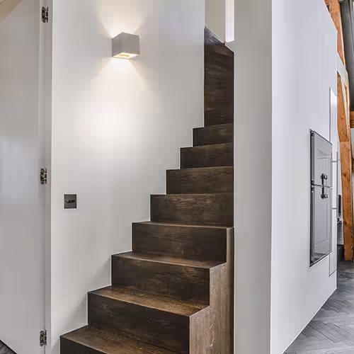 Dans la cage d'escalier , la fonctionnalité est primordiale. Les risques de trébucher, les coins sombres et les chemins peu clairs peuvent être évités grâce à un éclairage adéquat. Des luminaires proches des murs, des projecteurs pour marches ou des luminaires suspendus assurent une vision claire et un sentiment de bien-être. Les luminaires doivent être robustes et fiables, même en cas d'utilisation fréquente.