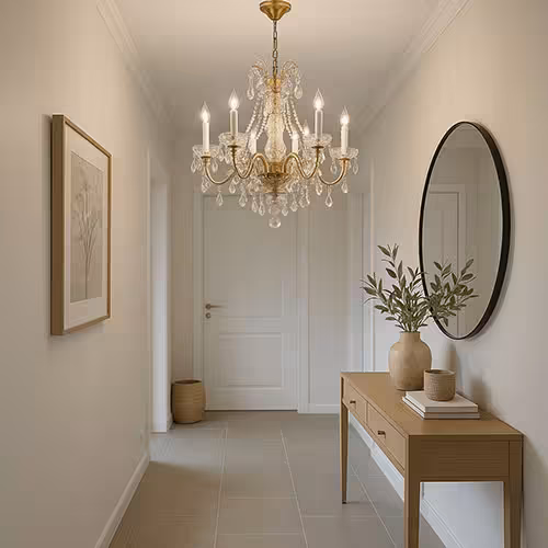 Qui a dit que le couloir n'était pas un lieu de glamour ? Un petit lustre apporte une forte touche de design. Ce sont surtout les bâtiments anciens ou les entrées spacieuses qui profitent de ce luminaire classique. Il donne une impression de qualité et de noblesse sans être envahissant. Il déploie tout son effet lorsqu'il est associé à des meubles sobres.